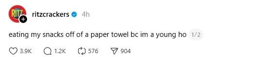 Sometimes a single tweet can say more about the state of marketing than a full campaign ever could. That was the case with Ritz Crackers’ now deleted post that briefly read, “eating my snacks off of a paper towel bc im a young ho”. It was up for only a short time, but long enough to be screenshotted, shared, debated, and dissected.